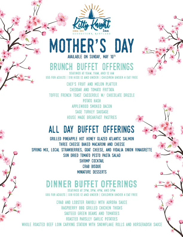 Celebrate Mother’s Day at Kitty Knight with a memorable Mother’s Day brunch and dinner buffet on the scenic Sassafras River on Sunday, May 10, 2026. Treat mom to a waterfront dining experience featuring a beautifully curated buffet with seasonal brunch favorites, chef-prepared dinner selections, and all-day offerings available at every seating.